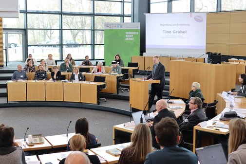 Zu der Veranstaltung unter dem Motto "Zukunft. Gemeinsam. Sozial. Gestalten." hatten die Liga der Freien Wohlfahrtspflege, der DGBkurz fürDeutscher Gewerkschaftsbund Hessen-Thüringen, der Sozialverband VdK Hessen-Thüringen und der Landesseniorenrat in den Thüringer Landtag eingeladen. Die übergeordnete Fragestellung lautete: "Wie lassen sich Strategien, Bedarfe und soziale Realität in Thüringen demokratisch und sozial gerecht verbinden?"
