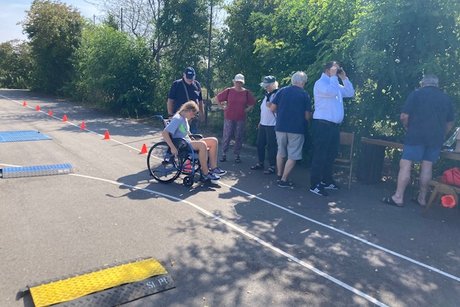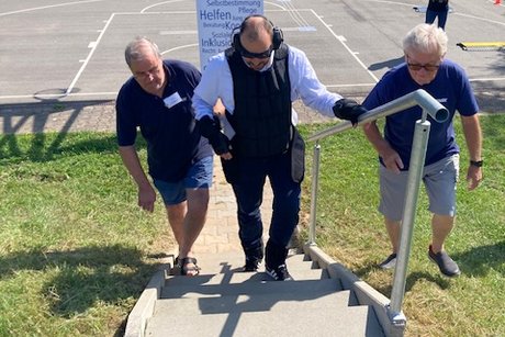 Bürgermeister Patrick Koch, auch Schirmherr dieser Veranstaltung, zog sich den GERT an, um zu sehen welche Schwierigkeiten das Alter noch vor sich hat. Auch den Rollstuhlparcour benutzte er um zu sehen welche Barrieren im Straßenverkehr es für Rollstuhlfahrer gibt.
